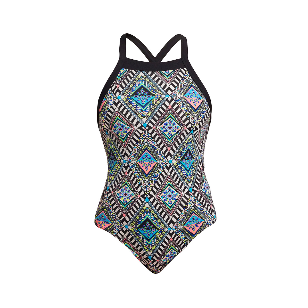 Maak een splash met de Funkita Ladies Sky Hi One Piece Weave Please. Dit stijlvolle badpak komt met brede, verstelbare bandjes en een hoge hals, wat het ideaal maakt voor dames tot een D-cup. De druppelvormige ruguitsnijding geeft je bewegingsvrijheid en een trendy uitstraling.