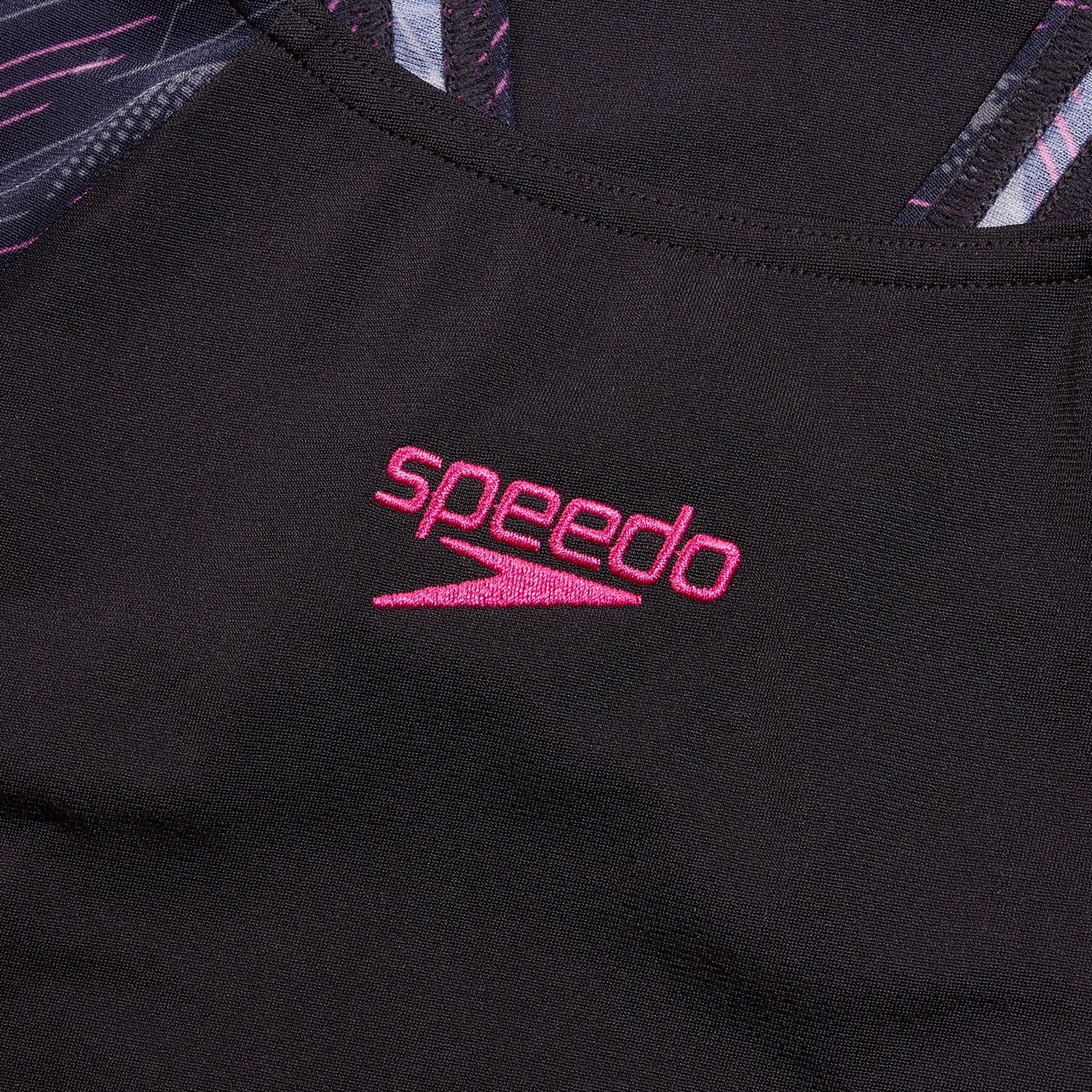 Met het Speedo Badpak Hyperboom Splice Muscleback in Zwart, Electric Pink en USA Charcoal ben je klaar om je zwemdoelen te bereiken!